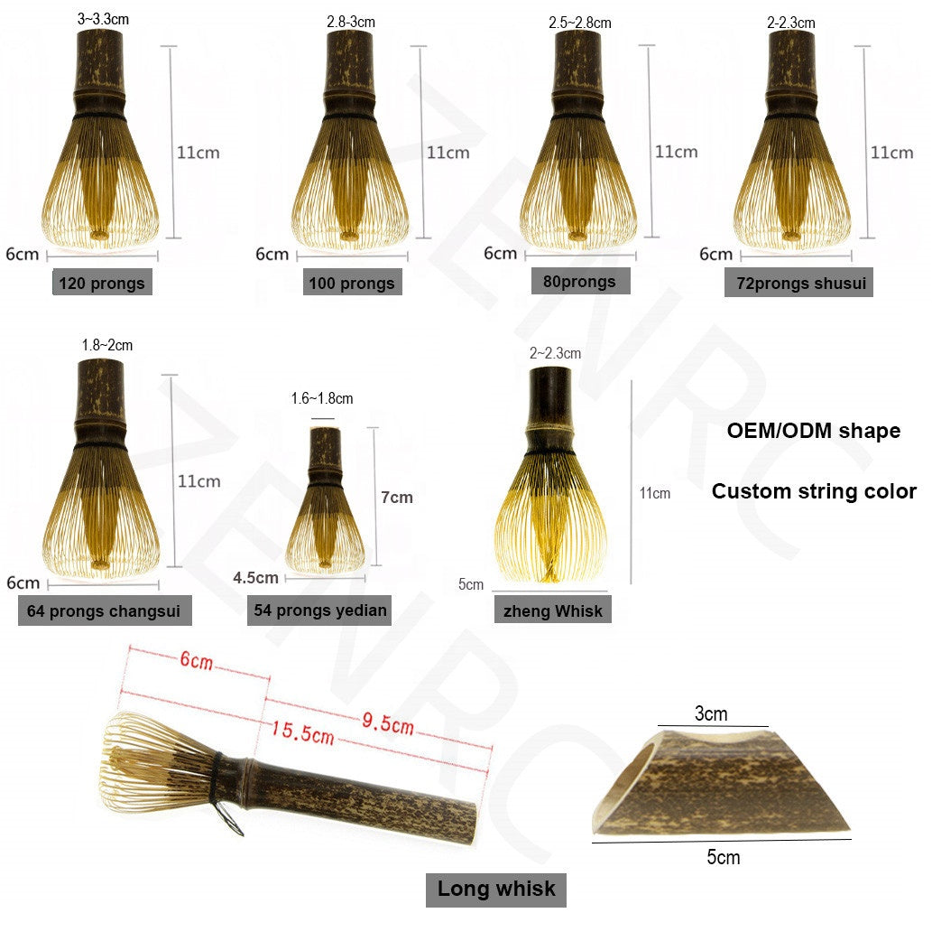 Choose the perfect matcha whisk for your brand: from 54 to 120 prongs, standard to specialty shapes, and long-handled options. All whisks are hand-carved from single bamboo for smooth, clump-free foam.