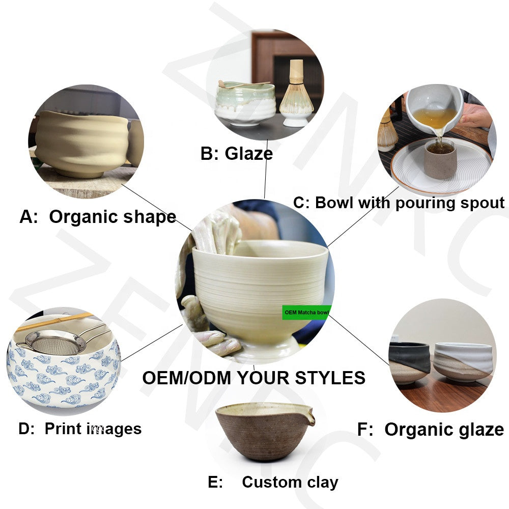 Design your perfect matcha bowl: choose from 6 customizable styles — from organic shapes to spout designs, glazes, and printed images. Each bowl is hand-crafted for durability and beauty.